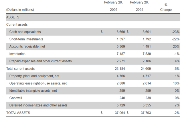 Zapasy wyniosły około 7,5 mld USD, co oznacza spadek o 1% w porównaniu z rokiem ubiegłym - niższy wolumen i inny asortyment produktów częściowo zrównoważyły wyższe koszty jednostkowe spowodowane taryfami. Środki pieniężne i inwestycje krótkoterminowe spadły do 8,1 mld USD, czyli o około 2,3 mld USD mniej niż rok temu, ponieważ przepływy pieniężne z działalności operacyjnej były niewystarczające do wypłaty dywidend, spłaty zadłużenia, nakładów inwestycyjnych i odkupu akcji.
