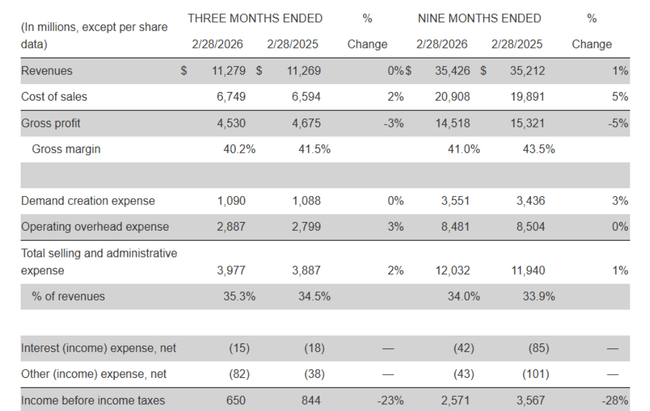 Marża brutto spadła o 130 punktów bazowych z 41,5% do 40,2%. Głównym powodem są wyższe cła w Ameryce Północnej, które zwiększają jednostkowy koszt importu. Koszty sprzedaży i administracji wzrosły o 2% do 4,0 mld USD: