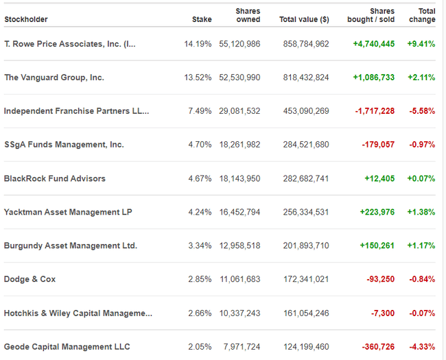 W tej tabeli możemy zobaczyć właścicieli News Corp. Największym właścicielem jest T. Rowe Price Associates, który zwiększył nawet swój udział o prawie 10%. Wicelider The Vanguard również zwiększył swój udział o ponad 2%. Jednak z drugiej strony 3. największy właściciel Independent Franchise Partners zmniejszył swój udział o ponad 5%.