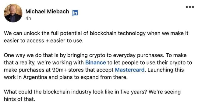 Jeśli chcesz inwestować w kryptowaluty, ale obawiasz się zmienności, to myślę, że wymieniłem tutaj 3 ciekawe sposoby, które w pewien sposób oferują zaangażowanie w grę kryptowalutową. Jednak zdecydowanie rozważyłbym coś takiego, wiem, że jest wielu kryptowalutowych naiwniaków, ale widać to, coraz większe firmy się angażują. Dzisiejszym przykładem jest ogłoszenie przez CEO Mastercard, że rozpoczynają współpracę z Binance nad integracją płatności kryptowalutowych, dla ich ogromnej sieci ponad 90 milionów użytkowników, co dla mnie jest bardzo byczym newsem i tylko potwierdza to, co zostało tutaj napisane.