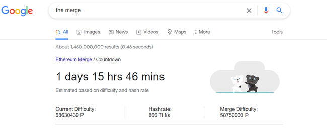 Gigant technologiczny Google dodał nowy licznik odliczający czas pozostały do nadchodzącej fuzji Ethereum jako pokaz wsparcia. Kiedy wpiszesz w wyszukiwarce dowolną odmianę "Ethereum Merge" lub "The Merge", pojawi się licznik odliczający przewidywany czas pozostały do połączenia w oparciu o aktualną trudność, trudność połączenia i hash rate.