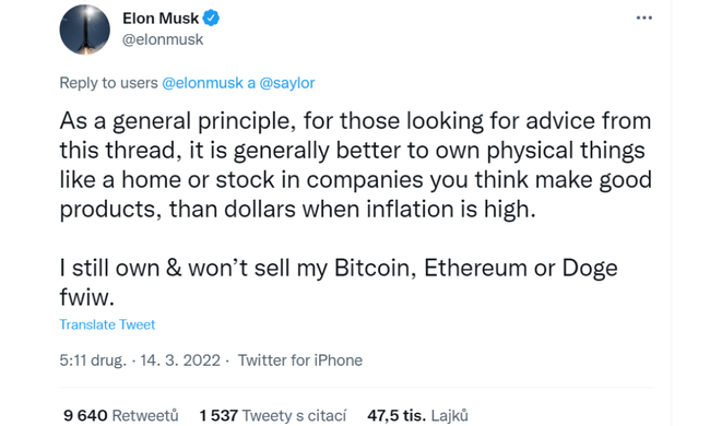 Te 3 kryptowaluty, które trzyma Elon Musk, nie zamierzają być sprzedawane mimo rosnącej inflacji