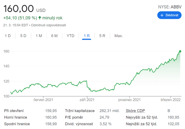 Większość akcji spółki spadła wraz z ogólnym spadkiem na giełdzie, jednak od początku roku AbbVie zyskała 17%. Moim zdaniem akcje tej dużej firmy farmaceutycznej będą nadal zyskiwać na wartości w dłuższej perspektywie. Ale oczywiście zależy to od analizy każdego inwestora. W dłuższej perspektywie czasowej prawdopodobnie nie ma znaczenia, kiedy dokonujemy zakupu, o ile mamy do firmy pełne zaufanie. Z czysto psychologicznego punktu widzenia mam awersję do kupowania na samym szczycie 😂