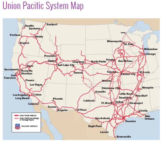 Union Pacific Corporation $UNP jest jedną z najbardziej rozpoznawalnych i najważniejszych firm w Ameryce. Zapewniamy krytyczne ogniwo w globalnym łańcuchu dostaw, łącząc koleją aż 23 stany w zachodnich dwóch trzecich kraju.
