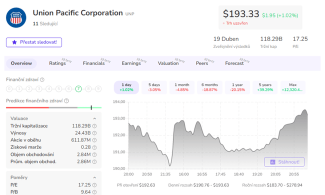 Średnia roczna stopa wzrostu zysku netto Union Pacific w ciągu ostatnich dziesięciu lat wynosiła około 7%.